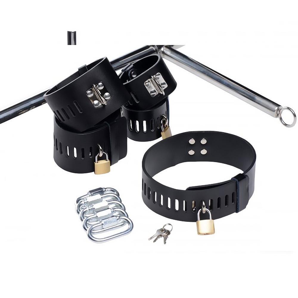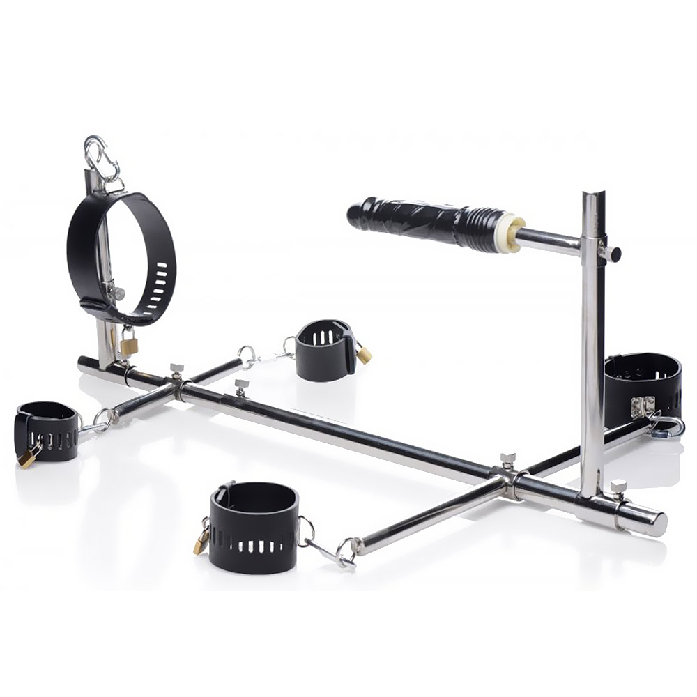 Alle Teile dieser bemerkenswerten Vorrichtung sind verstellbar, so kann die Basisleiste verlängert werden, die Höhe des Dildos und des Halsbands angepasst und die Position der Handgelenke und Knöchel verändert werden.