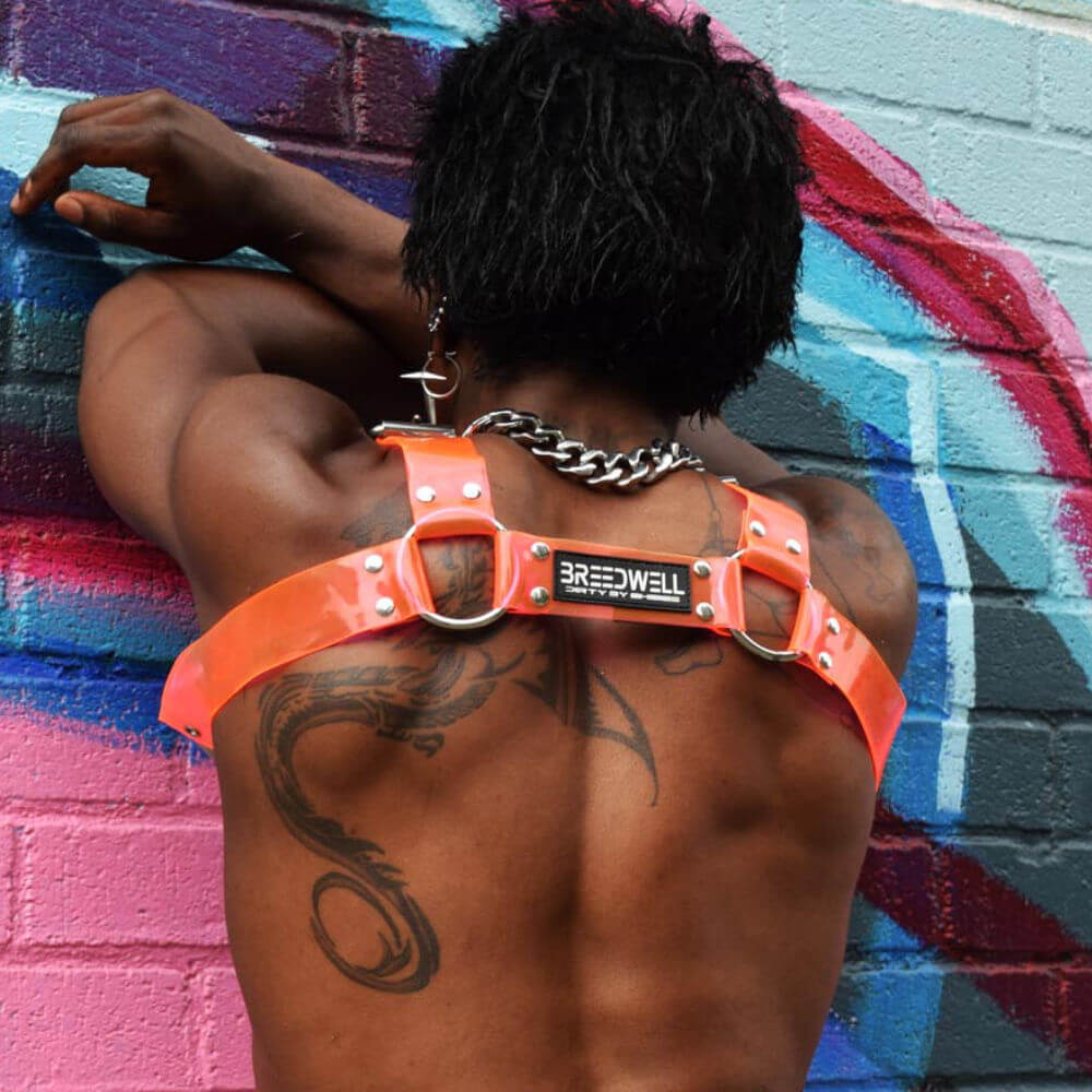 This orange harness with a radiant and iridescent rainbow look draws everyone's attention to you! The material made from PVC and holographic foil really comes into its own under black light, where it starts to glow! The harness itself has the classic and true Bulldog look that no one can resist! The middle piece can be easily removed at will and has a practical D-ring for all kinds of kinky games! Simply ideal for every situation! But watch out: If you look so good, it's possible that the harness won't stay on your body for long!
