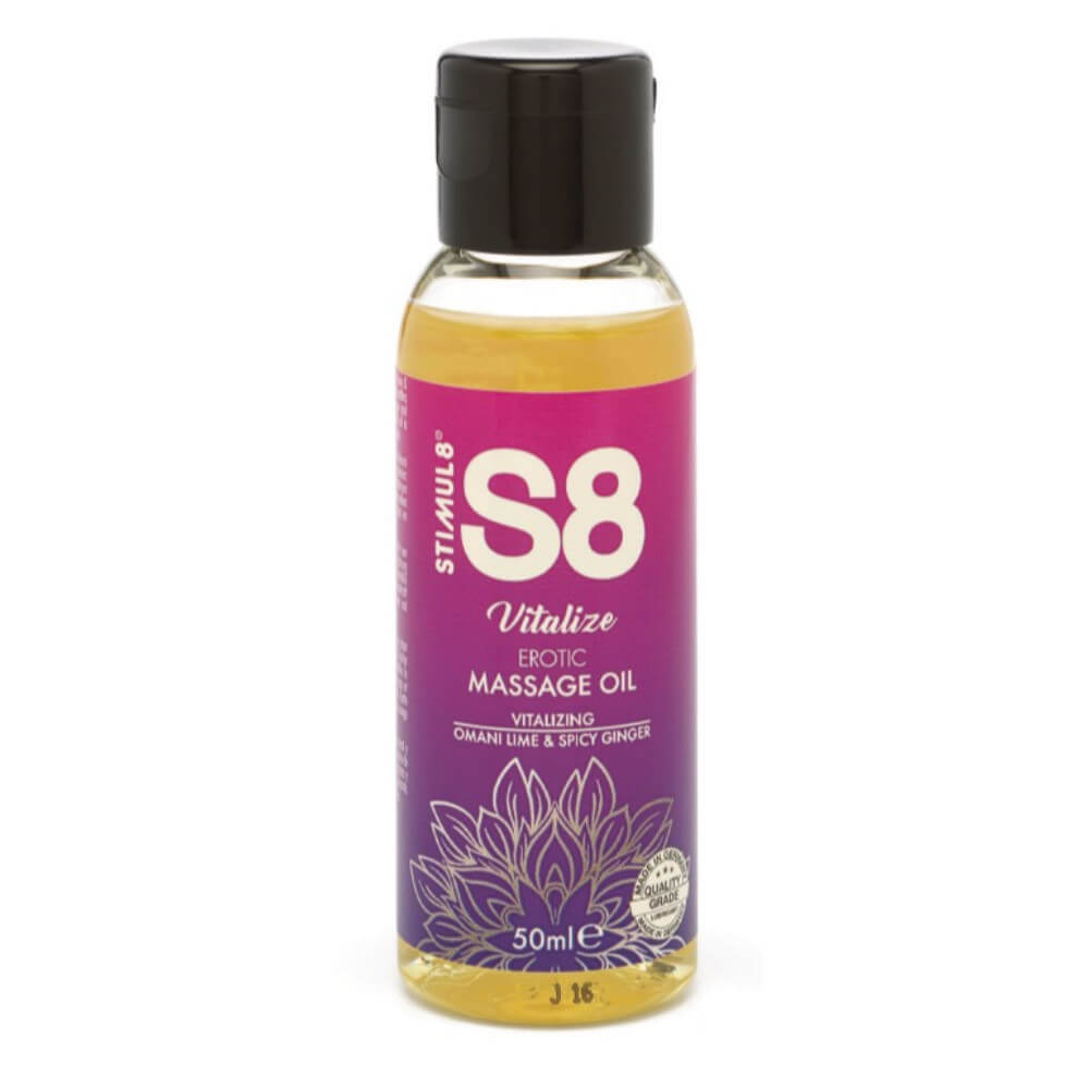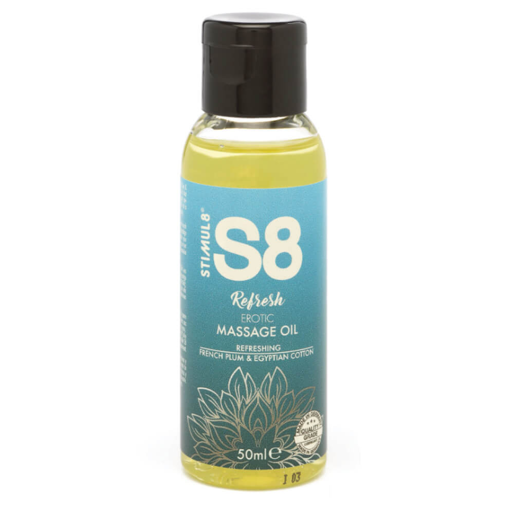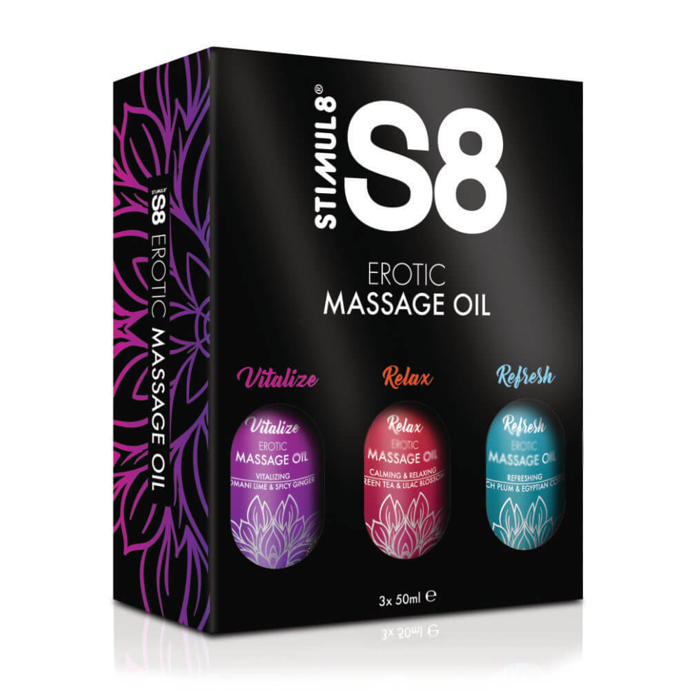 Die reichhaltigen Massageöle von S8 sind eine einzigartige Mischung aus drei kraftvollen Ölen: Jojobaöl, das die Haut beruhigt und stärkt, Mandelöl zur Befeuchtung und Pflege und Sesamöl, das äußerst nährend und gleitfähig ist. Zusätzlich sind die Öle mit essentiellen Vitaminen und Mineralien angereichert. 3 verschiedene Düfte sorgen für extra Abwechslung und prickelndes Vergnügen.