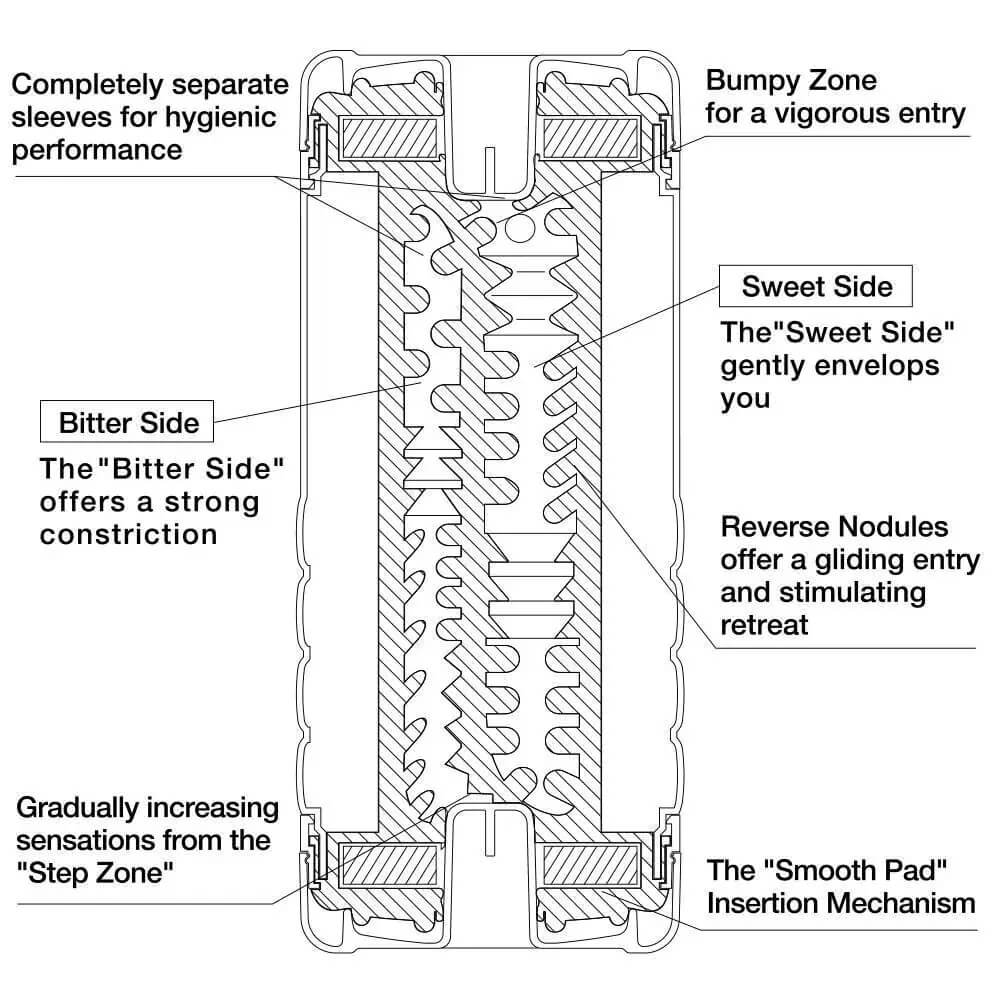 This absolutely awesome double masturbator leaves nothing to be desired! With its two completely separate inputs, it opens up a completely new world for solo and multiplay through different structures. "The Sweet Side" completely encloses your cock gently, while "The Bitter Side" offers a firmer contraction.