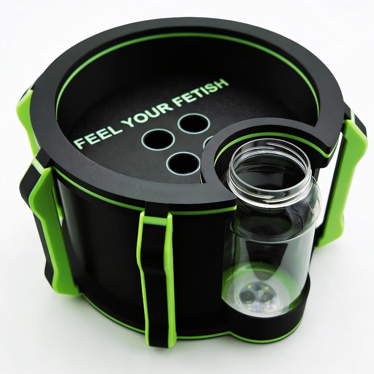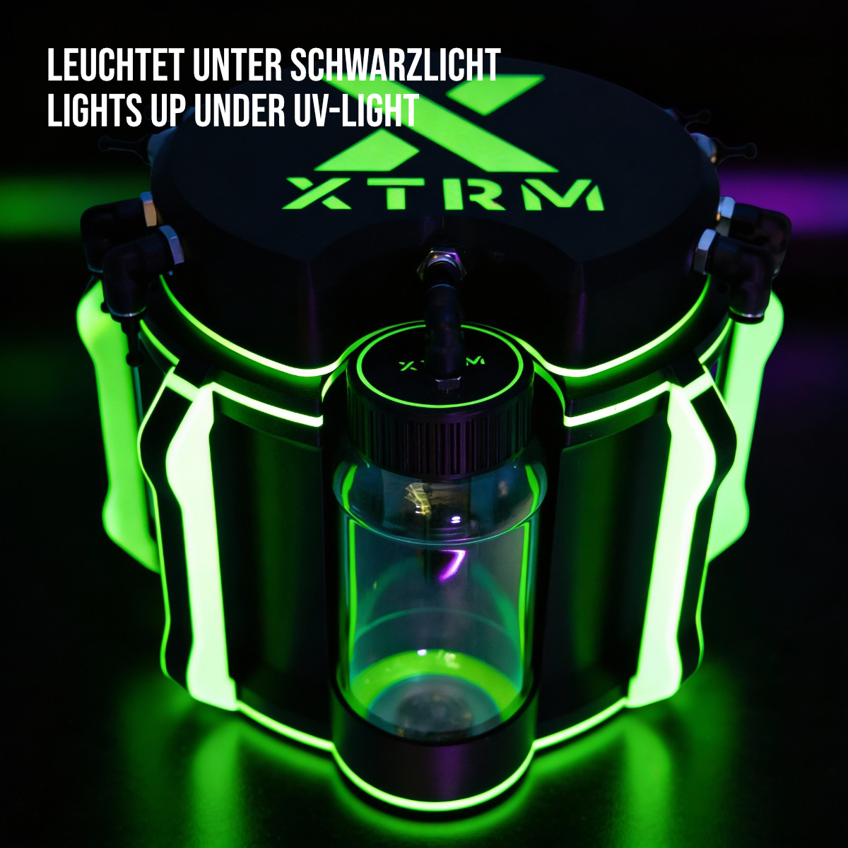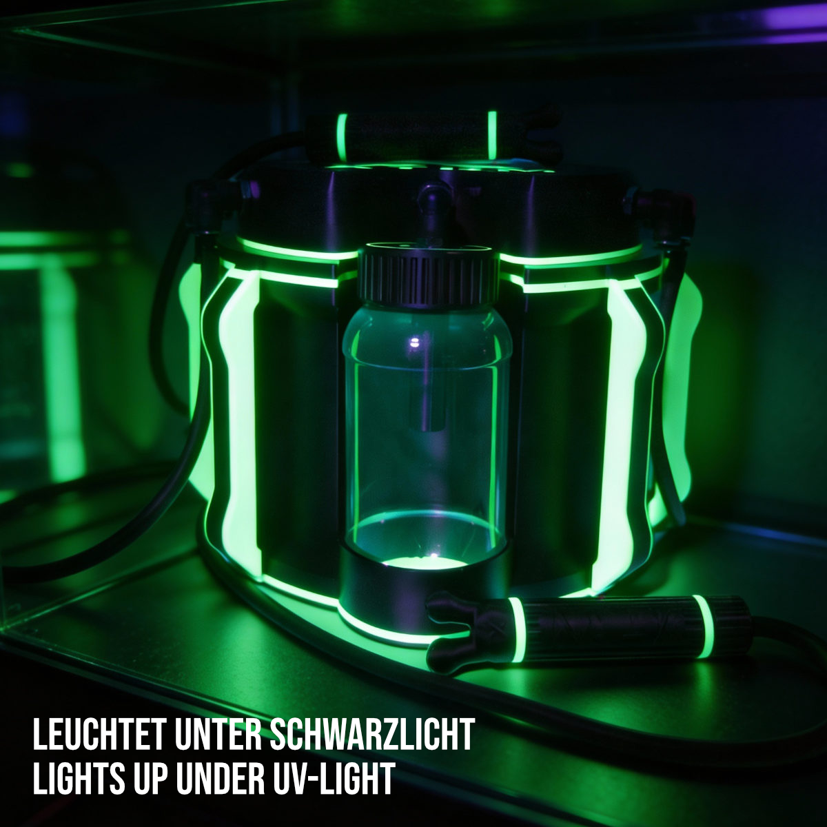 Visuell ist die Big Bang Station eine Klasse für sich: Das spacige Gehäuse leuchtet in einem Glow‑in‑the‑Dark‑Finish, das in dunklen Räumen sofort ins Auge springt und im Kopf bleibt. Dazu kommt das eigentliche Highlight: Eine integrierte LED-Leiste unterhalb des Haupttanks bringt Licht an den Punkt, wo’s darauf ankommt. Du siehst jederzeit, was abgeht, selbst bei minimalem Raumlicht oder kompletter Dunkelheit.