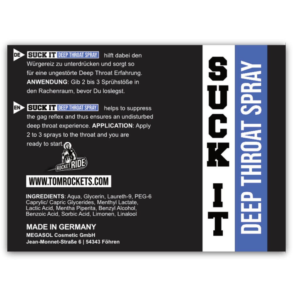 Mit dem SUCK IT - DEEP THROAT SPRAY von Rocket Ride hast Du den perfekten Helfer an Deiner Seite, um selbst große Schwänze beinahe mühelos in Deinem Hals verschwinden zu lassen!